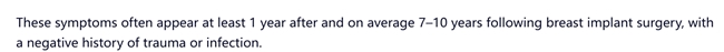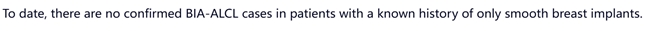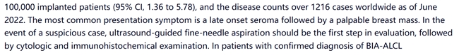 2022 年 BIA-ALCL 世界共识会议实践建议更新 从临床表征来看,BIA-ALCL有着鲜明的发病规律,可作为风险识别的重要依据:核心症状为迟发性血清肿,具体表现为假体植入术后一年以上,单侧乳房出现不明原因的肿胀、积液,且多数情况下无明显疼痛感;其平均潜伏期约为7-10年,这意味着植入者需长期保持健康警觉,而非短期观察无异常即可放松管控。科学界已有高度共识:BIAALCL的风险并非均匀分布,而是高度集中于毛面假体这一类别。