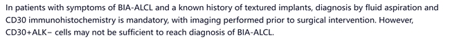 基于当前最新认知的 BIA-ALCL 诊疗临床建议 科学应对:构建全周期风险管控体系 结合国际临床指南与实践经验,针对毛面假体植入者的BIA-ALCL风险管理,需建立“预警识别-规范诊断-标准治疗-长期监测”的全周期体系,以科学手段筑牢健康防线。 精准识别预警信号是风险干预的第一道关口,需牢记核心警示:术后一年以上出现的单侧乳房不明原因肿胀,是BIA-ALCL最典型的早期表现,一旦出现此类症状,务必第一时间前往正规医疗机构就诊,切勿因拖延错失最佳干预时机。规范诊断是精准治疗的前提,临床中常规采用“超声检查+积液细胞学检测”的组合方案,其中CD30免疫组化检测是确诊BIA-ALCL的关键指标,可有效区分良性积液与病理性改变,避免误诊漏诊。